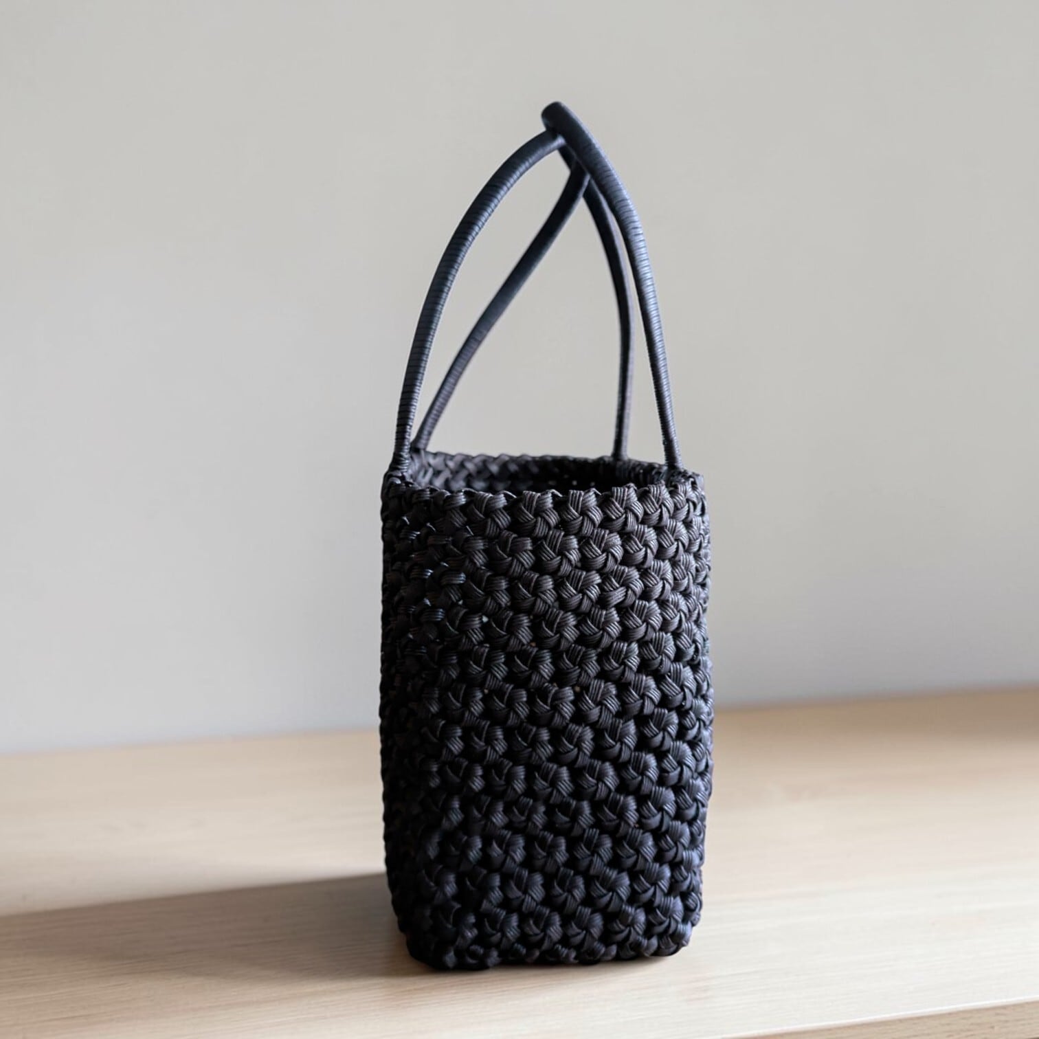 「花結び編み」が特徴の、シンプルで美しい黒のカゴバッグです。