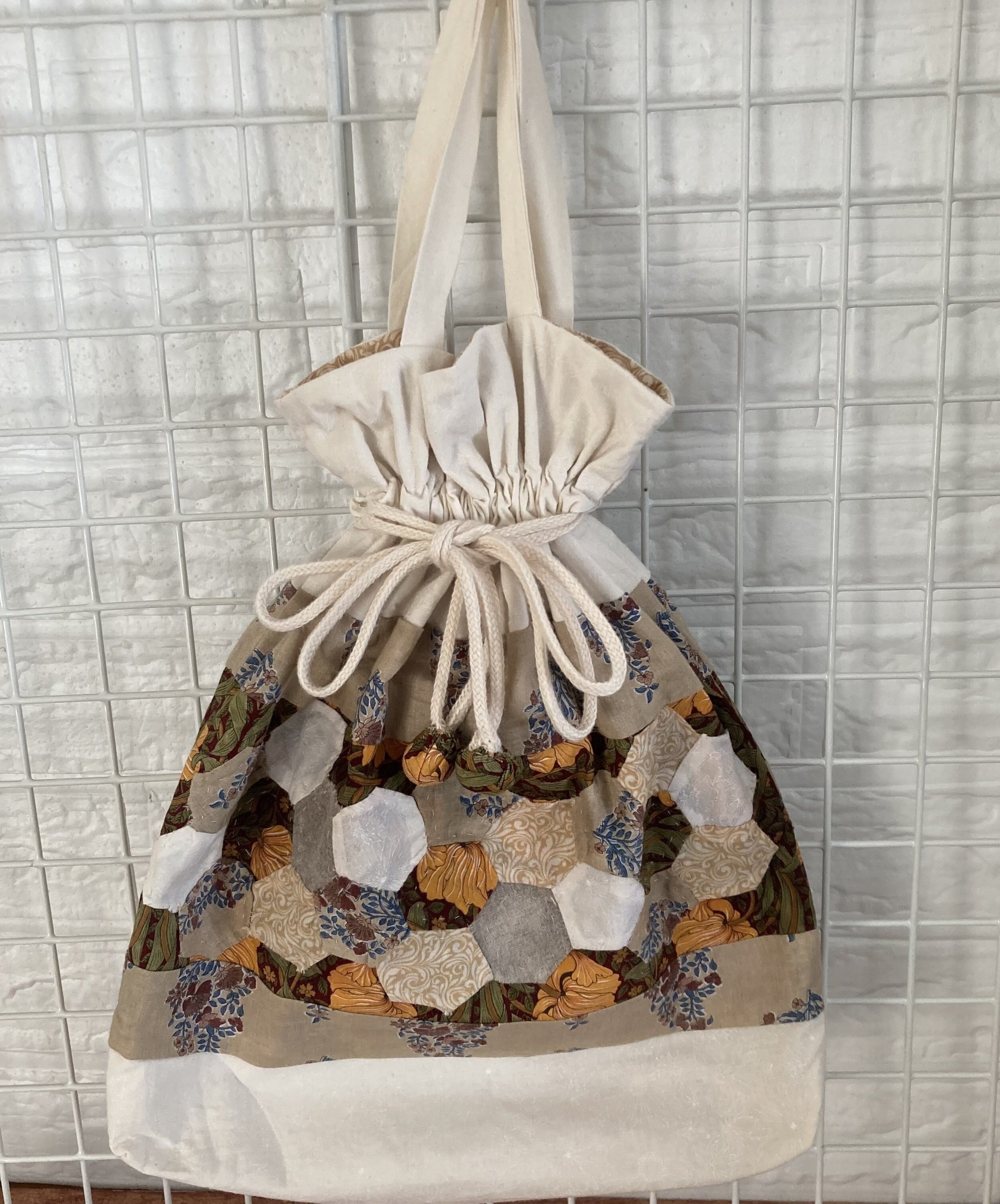 パッチワーク部分は、すべて手縫いです。ヘキサゴンという六角形のピースをつなげています。制作には5日間をかけ、時間をかけて丁寧に、ひと針ひと針縫い上げました。