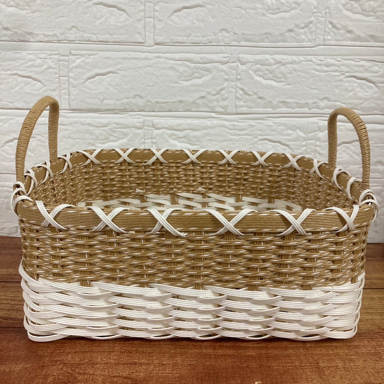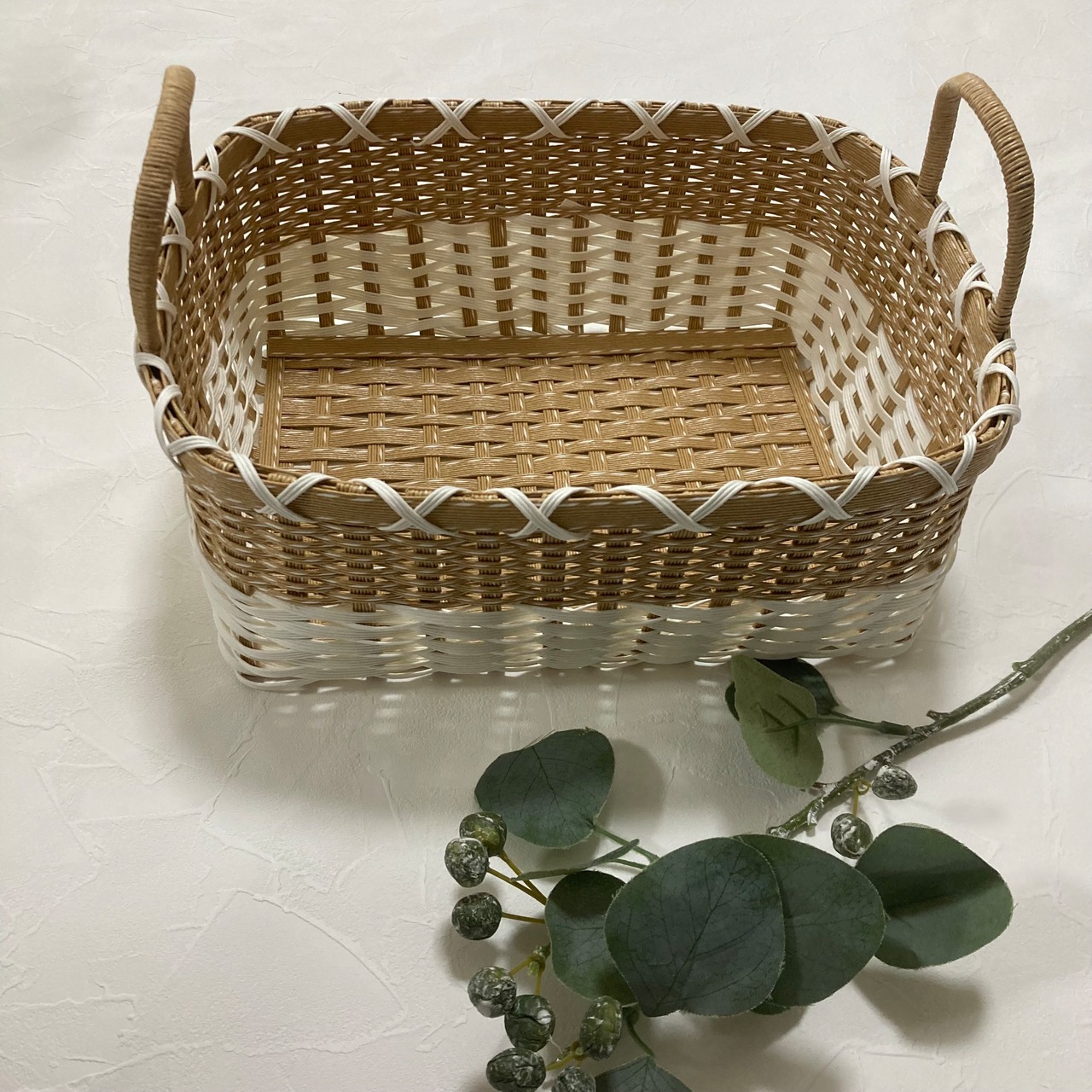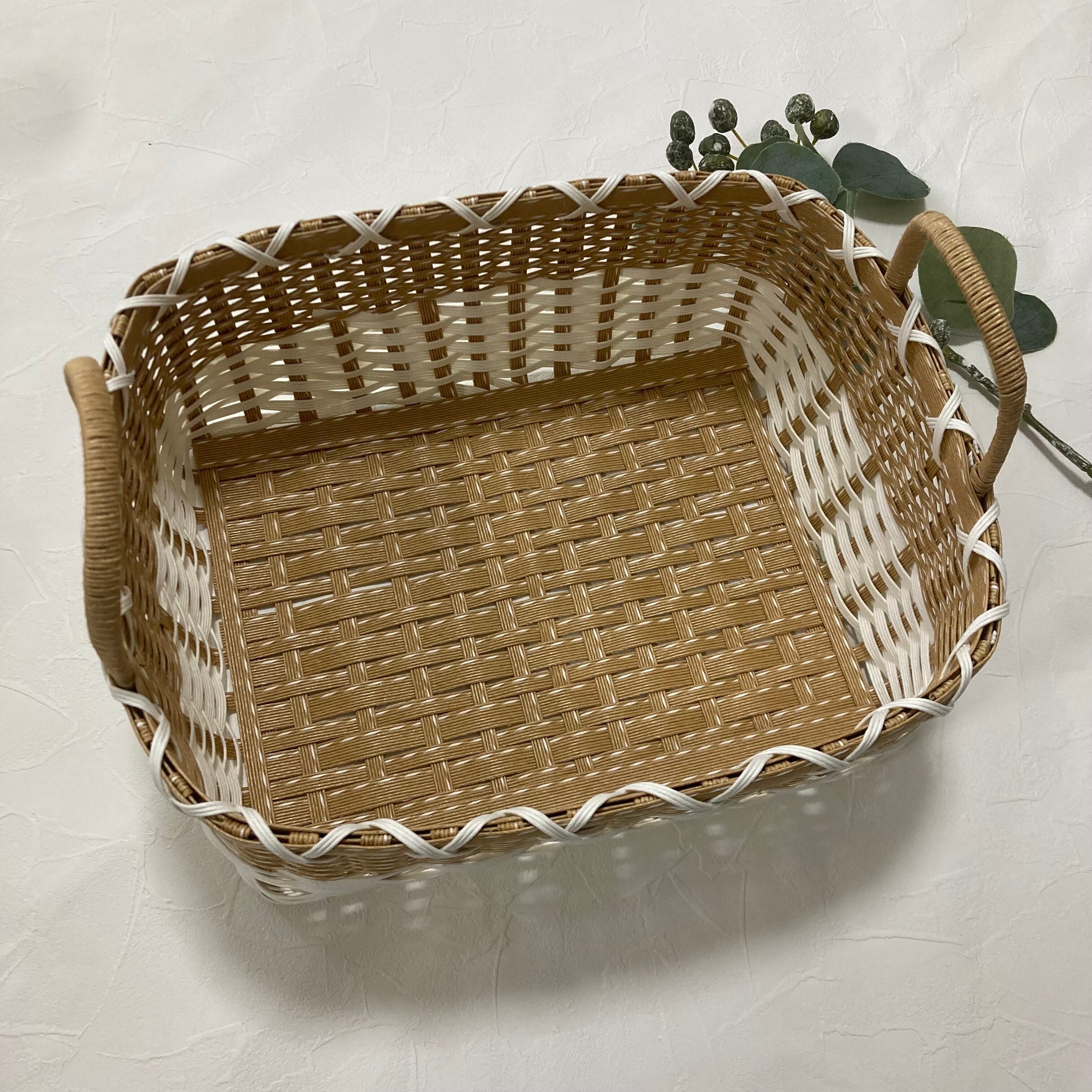 【パンケースや小物の収納などに便利な、持ち手付きのクラフトバンド製かご】