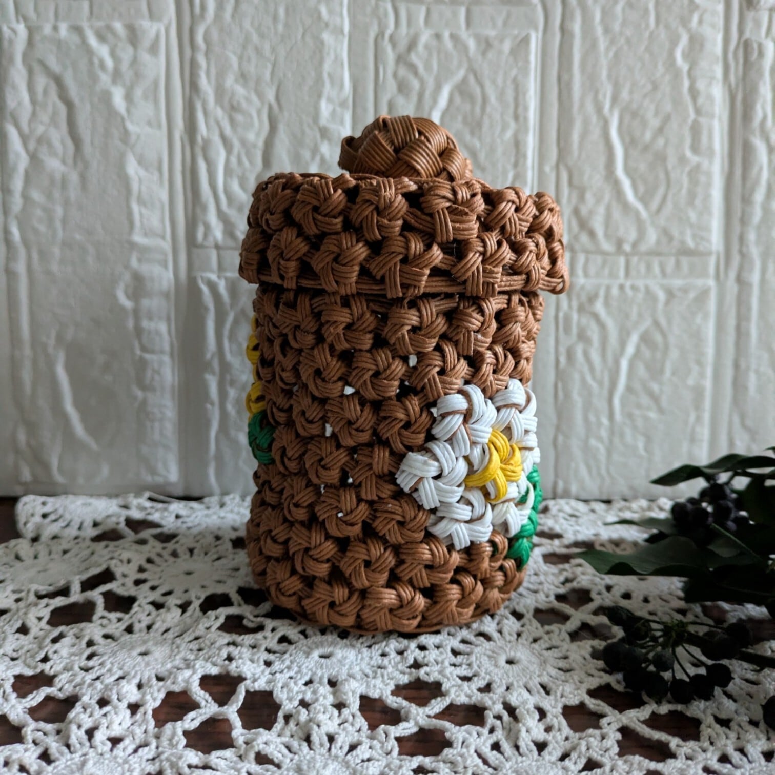 マロンカラーと椿の花で和の美を纏う、花結び編みの蓋付き綿棒ケース 小物入れ デスク周りの収納に