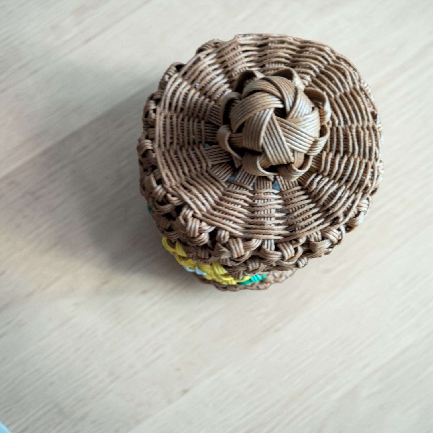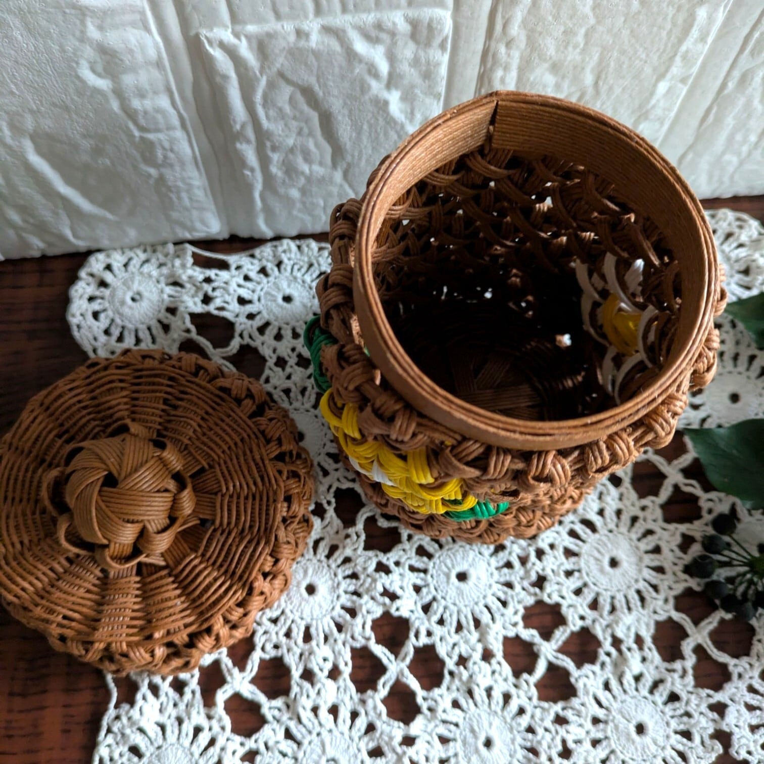 花結び編みを施したクラフトバンド製の綿棒ケースです。